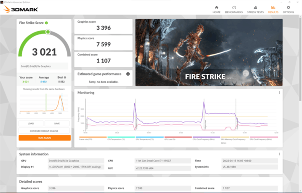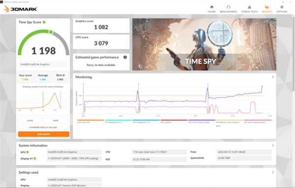 GPU方面是集成的锐炬Xe显卡,96EU,最大频率1.4GHz,在3DMARK的FS、TS测试中的成绩分别为3396分和1082分。