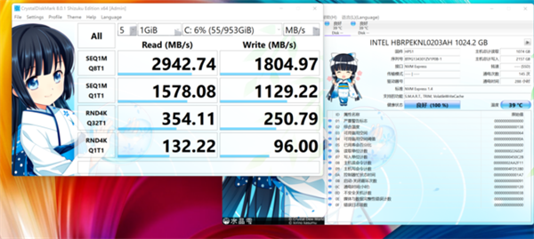 硬盘方面,容量1TB的PCIe3.0固态,来自英特尔,型号HBRPEKNL0203AH,也就是英特尔H20.1TB固态+32GB傲腾。实测最大读写速度可以达到2942MB/S+1804MB/S,性能表现属于高端的PCIe3.0固态,开机速度以及打开应用程序的速度得到了保障。