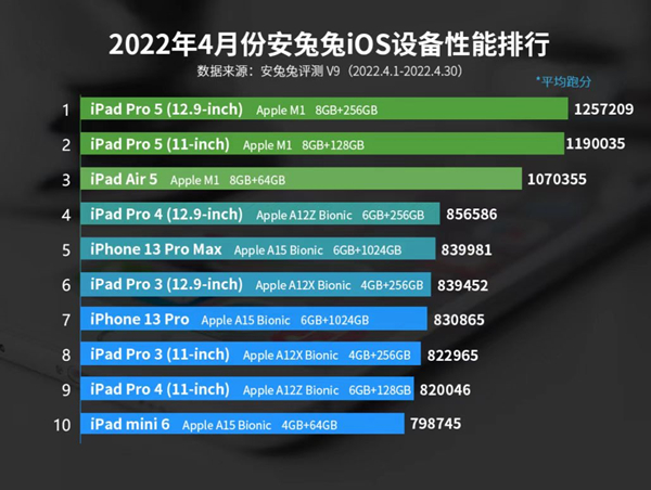 4月iOS设备性能榜:搭载M1芯片iPad领跑 ️