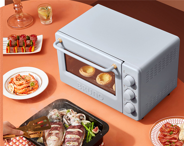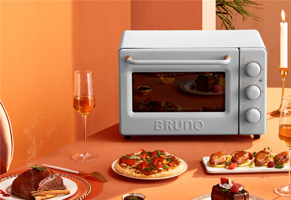 BRUNO熏烤料理箱有2个颜色:海盐蓝、荼白灰,复古的旋钮负责调控,18L的容量,对于5口之家来说,是完全足够的。正面是带有玻璃视窗的烤箱门,烹饪过程可一览无遗。下边巨大的BRUNO品牌logo,增加了产品整体的质感。
