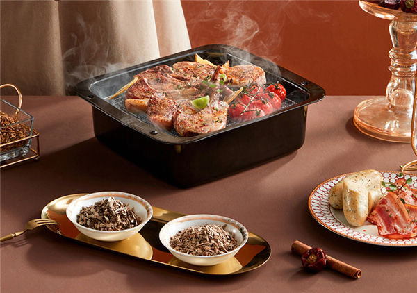 BRUNO熏烤料理箱带有烟熏功能,所以附件相对普通烤箱更多一些。烟熏锅由上下两个锅具组成,都是搪瓷材料打造,便于使用后的清洗。烟熏锅需要搭配烟熏网架使用,网架为双层可拆卸结构以及同样有搪瓷材料烟熏接油盘。烟熏的味道是利用附带的3种果木木屑通过高温来释放天然木材的香气。烤箱自带了苹果、核桃、樱桃木屑,后期可购买。