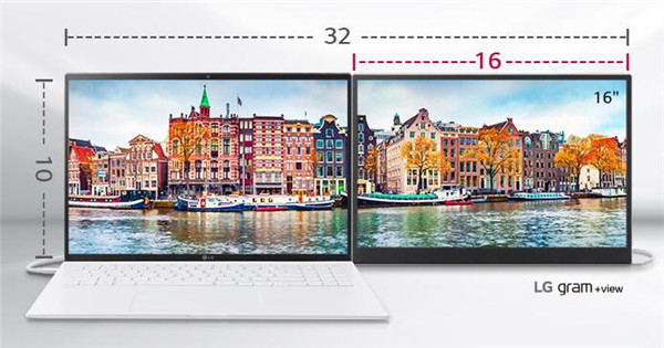 16:10画面比,使用gram扩展屏体验更大视界,连接16英寸的L .G gram笔记本,双屏显示畅享32:10画面比,双屏显示高效率,生产力加倍。