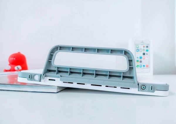 在外观设计上,华为移动路由Pro依旧采用了平板设计,三围尺寸仅为219*138*25.6mm,仅有一个记事本大小;重约为330g,相比上一代稍重(246g)。整体为白色设计,但腰线部位与支架的灰色保持一致。