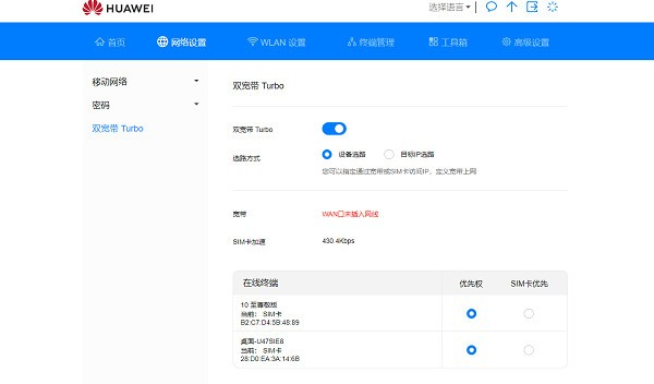 其次华为移动路由Pro支持双网双通,也就是说有线宽带和4G网络可以同时存在并同时工作。对于不同终端的联网需求,在双宽带 Turbo页面还可以针对每一个终端进行网络设置是宽带优先还是SIM卡优先;所有的联网终端也是一目了然。