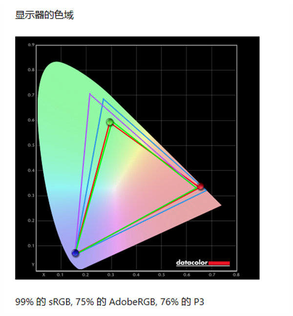实测这块屏幕覆盖99%sRGB色域,最大亮度为450尼特,平均色准0.64.450尼特的高亮度使其在高光环境比如户外或靠窗的位置也能看清楚屏幕。此外,高色域和较好的色彩还原可以给使用者良好的屏幕观感。