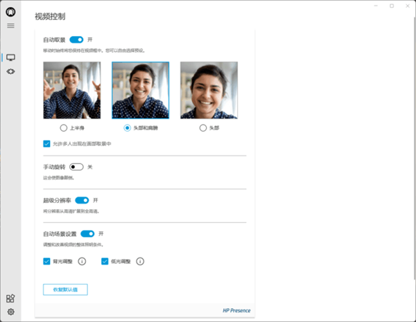 该摄像头为720P广角摄像头,拥有WDR宽动态范围技术,调节光感,在视频会议时可以降低高亮部位或暗部,使用者可以更加清晰的进行视频会议。与此同时,通过系统内置的myHP软件可以开启摄像头自动取景功能,开启后可以使人脸自动居中。