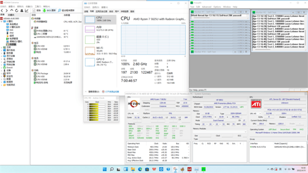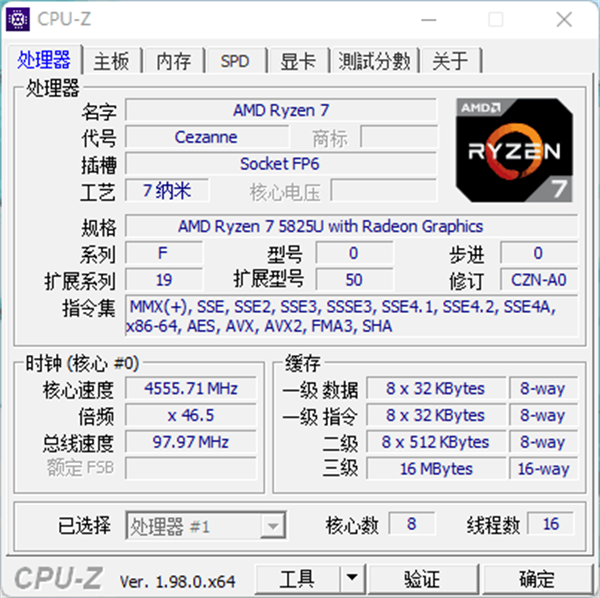 我手中这台惠普EliteBook 600配置的处理器为AMD锐龙R7 5825U,最新的Cezanne架构,7nm工艺,拥有八核心十六线程,最大睿频4.5GHz,三级缓存16MB,TDP15W。