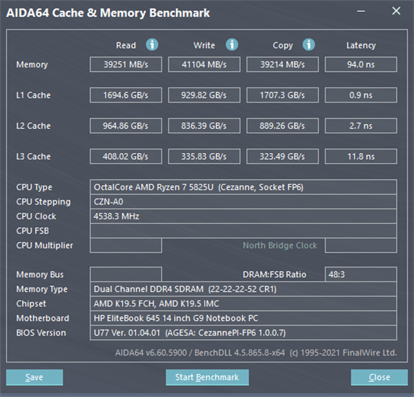 5825U相当于之前5800U的Refresh版本,加之惠普本代商用机在性能调较方面有了一定的进步,EliteBook 600上的CPU多核性能和单核性能在商务本中算是非常不错的了,面对办公是绰绰有余了。