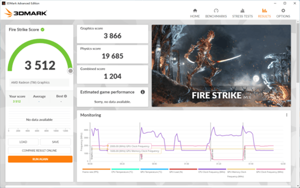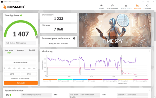 GPU方面为5825U中集成的AMD Radeon Graphics,8个GPU核心,频率2000MHz,在3DMARK基准测试中Fire Strike模式GPU得分3866.Time Spy模式GPU得分1233.其性能在工作之余可以进行轻度的网游娱乐,由于不是本机的主要使用场景,在这里我们就不做这方面的测试了。