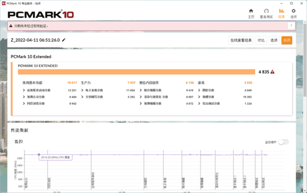 综合性能方面,选用PCMARK10的Extended模式进行测试,总得分4835分,说明其综合性能较好,可以轻松完成日常和办公场景下的应用。各项目的得分情况如下:在包含了网页浏览、视频会议、应用程序启动的常用基本功能部分得分10017分;在包含了文档、表格编写的生产力部分得分7927分;在包含了照片编辑、视频编辑、视频渲染的数位内容创作部分得分6130分;在游戏部分得分3035分。