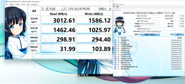 硬盘是来自三星的PM991a,容量512GB,PCIe3.0.最大顺序读写速度为3000MB/S+1580MB/S,属于中高档的PCIe3.0固态,开机速度、打开文件的速度、文件传输的速度都得到了保障。