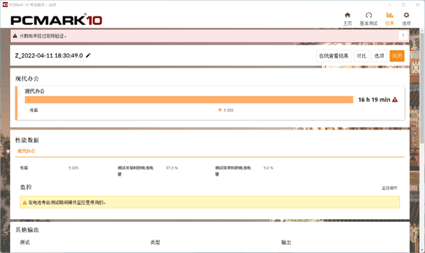 使用PCMARK 10的现代办公模式进行续航测试,全程连接Wi-Fi,开启Win11的省电模式,得到的最终成绩为16小时19分钟,可以完全满足正常情况下的全天办公,续航能力非常优秀。