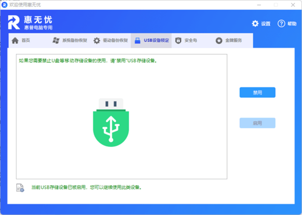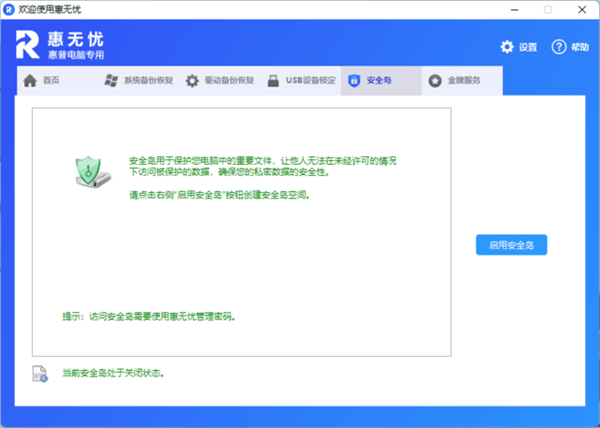 为防止数据外泄,惠无忧可以对禁止USB接口向外传输数据;还有安全岛功能可以对重要文件进行加密保护;当然了,进入惠无忧是需要独立密码的。总体来讲,惠无忧的存在可以很方便的为用户的数据提供安全保障。