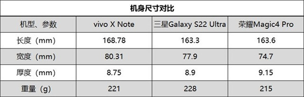 在握持舒适度方面,vivo X Note与荣耀Magic4 Pro的单手握持体验要优于三星Galaxy S22 Ultra,前者采用了全弧面边框,握在手中屏幕不割手,更易单手操作,大幅提升了单手握持时的舒适度;后者虽然边框为弧面但是过于平直的机身底部会形成一个90°夹角,损失了一些单手握持感。