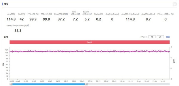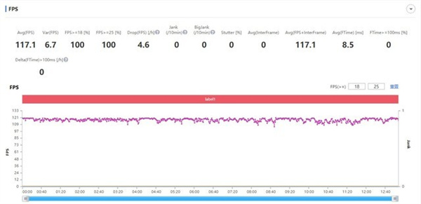 三款机型在《王者荣耀》游戏中的表现还是有一定差异的,相比较而言vivo X Note的表现最好,平均帧率为117.1帧,帧率曲线相对于平稳。在游戏过程中,得益于120Hz的高刷屏幕,使操作更加顺滑,屏幕显示几乎没有任何延迟。综合来看,这三台手机的表现都处于现在的正常水准,都能为大家带来不错的性能表现。