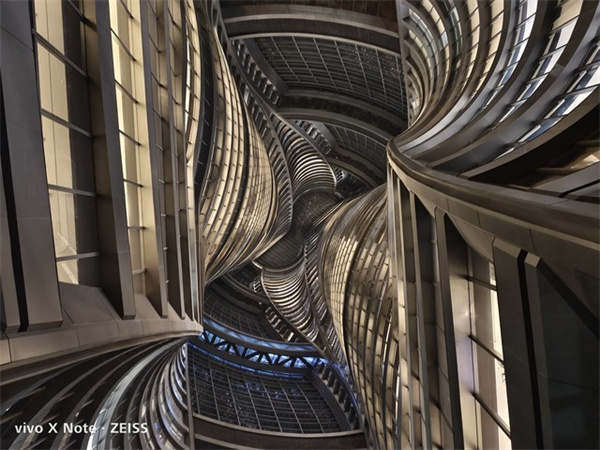 如果说在外观上三款手机哪里最不一样,那还是要看手机的背部。vivo X Note采用了vivo经典的云阶设计,整个镜头模组呈阶梯状上下堆叠,四颗镜头组成的圆环占据了方形装饰件的左侧区域,圆形模组与方形装饰件之间采用微曲延伸的玻璃面衔接,一体化的设计减少了视觉割裂感同时也起到很好的防尘作用。