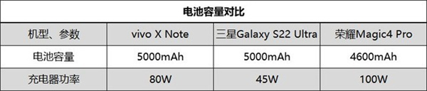 而在充电测试中,荣耀Magic4 Pro与vivo X Note的表现均非常出色,在30分钟时都能将手机充满电,而三星Galaxy S22 Ultra由于采用了45W快充方案,所以在充电速度方面优势不大,最终用时50分钟将手机充满。所以大家要是想要追求更快的充电速度,荣耀Magic4 Pro与vivo X Note的优势更大,也能更满足大家的日常需求。