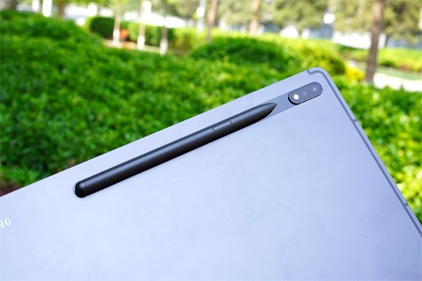 三星Galaxy Tab S8+ 5G版机身上有两个位置可以磁吸收纳S Pen,分别是机身上边框与机身背部的装饰条,仅当S Pen位于背部装饰条时也能够进行磁吸充电。