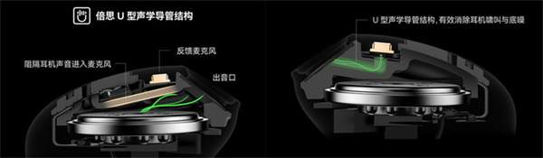 在这个基础上,倍思还加入了一些自己的设计,比如U型声学导管结构,这种倍思独立设计的新型降噪耳机反馈麦克风腔体结构目的是让反馈麦克风和发生单元无直接耦合,阻隔耳机内的声音进入麦克风,从而降低高频响应,消除耳机啸叫与底噪。