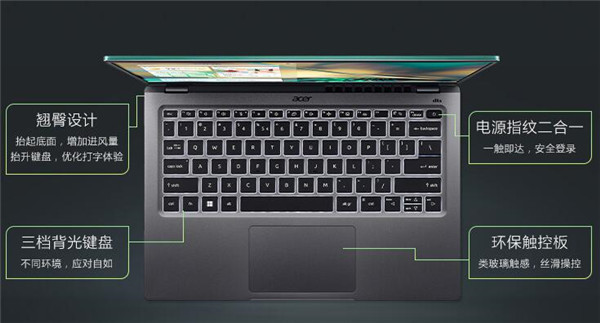 全尺寸三档背光键盘,配合大面积的精密触控板让您肆意发挥,灵活操控电源键集成指纹识别,保护隐私的同时轻松唤醒,操作更便捷。