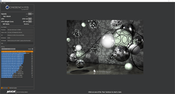 规格的优秀是需要通过软件测试来佐证性能卓越的,所以,使用CINEBENCH测试标准对处理器进行实测。实测结果显示,Cinebench R15多核2724cb、单核261cb;Cinebench R20多核6544cb、单核697cb;Cinebench R23多核15686pts、单核1809pts。从评分来看,OMEN暗影精灵8Plus基本发挥出了酷睿i7-12700H处理器的单核和多核性能,在CPU性能调校层面也是做的比较到位。