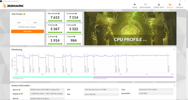 3DMark的CPU PROFILE可以对处理器进行单线程到多线程的全部测试,在这一测试标准下,英特尔12代酷睿i7-12700H处理器单线程得分高达984.2线程得分1914.4线程得分3322.8线程得分5367.16线程得分7114.最大线程数综合得分7615.单线程与多线程性能得分可以看出,运算的速度提升明显。得分代表了笔记本在运行单线程应用或是多线程应用时的运行速度,如此得分,大大节省了用户在应用时的等待时间。