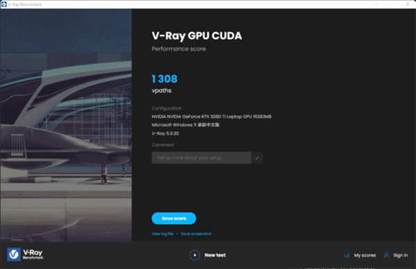 在V-Ray BenchMark的GPU渲染测试部分(CUDA),这颗RTX 3080Ti Laptop GPU得到了1308 vpaths的分数。而在V-Ray BenchMark的GPU光线追踪测试部分(RTX),则得到了1912分。从这两项分数来看,相对于其他品牌搭载RTX 3080Ti显卡的机型,OMEN暗影精灵8Plus的得分也是要高一些的。