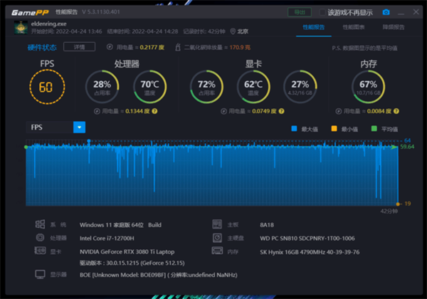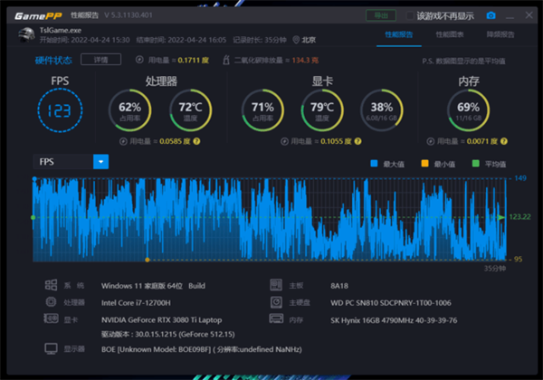 在测试之前,我们将这款机器的显卡驱动升级为最新的512.15版本,惠普游戏控制中心软件版本为v.1101.2203.4.0.BIOS版本为AMIF.05.而为了探究其性能表现,测试时全程开启狂暴模式和独显直连模式。同时,测试期间全程连接电源适配器,并确保电池满电。