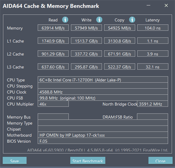 使用AIDA64中的Cache&Memory BenchMark,读、写、复制的速度达到了63914MB/S、57949MB/S、54925MB/S,虽然延迟略高于DDR4时期,但读写和复制的速度有了成倍的提升。