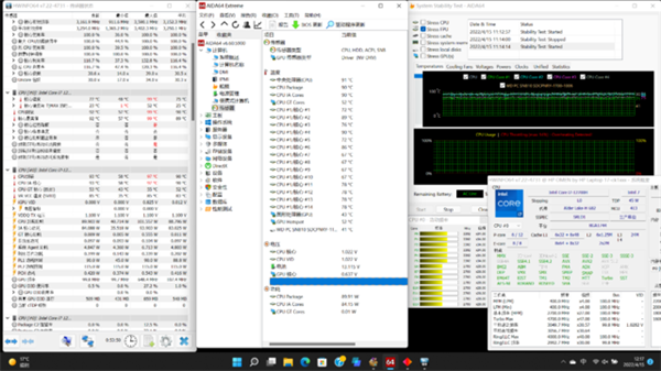 使用AIDA64系统稳定性测试的StressFPU模式,测试时间一个小时。这颗i7-12700H的Package功耗89.91W,IA Cores 84.15W,P核心3.4GHz,E核心2.8GHz,CPU Package温度93度。