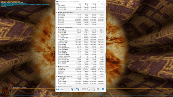 CPU+GPU双烤机测试下,处理器核心温度为94℃,高性能核3.0GHz,高效能核心为2.5GHz。此时其显卡温度为76.9℃,CPU+GPU功耗释放达到69W+155W,CPU与GPU性能均达到最佳状态,整体调校优秀。