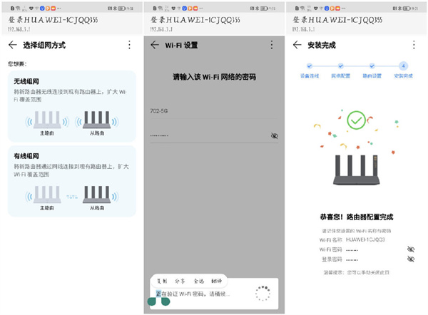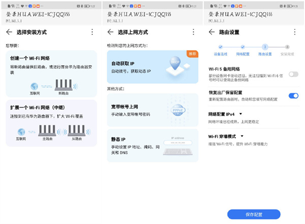路由插上电,等待十几秒正常开机后,在手机端搜索带HUAWEI开头的WIFI信号源点击连接即可跳转到配置界面,可选择作为主路由还是中继使用。首先是作为主路由使用,选择创建WIFI,支持自动获取IP、宽带拨号和设置静态IP等上网方式,按照步骤设置密码即可完成配置。