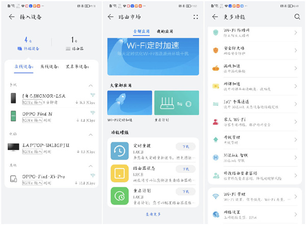 连接成功信号后,华为手机打开智慧生活APP即可绑定路由,可更直观的查看接入设备管理、手游加速、儿童上网模式管理以及网络测试功能,还支持内置小应用的安装,诸如定期重启计划、加速等为路由的更好运行做出更好的解决方案。