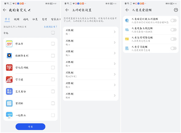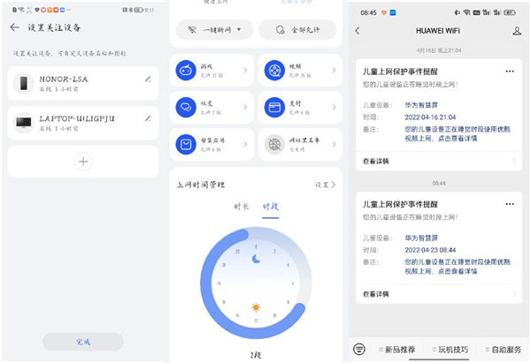 独立界面可管理联网设备,可单独对每一个设备设置管理计划,诸如家里的智慧屏电视,你即使在外也可随时给设备断网连网,支持时长限制、支付限制、游戏限制、视频限制、社交限制、不良网站拦截等,保护孩子健康上网,对于预警的内容可直接微信推送给家长,随时监控家里用网安全。