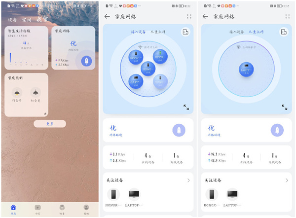 在新版的智慧生活管理,还内置了超级路由管理中心,可一键管理与监测家里网络内在线设备,圆形图标的显示,一键拖拽即可管理设备,随时查看家庭网络状况,更方便于我们远程管理使用。