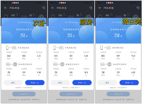机友家是小四室,面积120平,路由放置在客厅,也分别跑了不同位置测试了速度,按照测试结果表现全优,信号强度覆盖由内而外路由衰减,整体上很稳定。