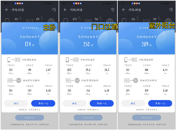 其次是穿墙测试,主卧与客厅隔了两堵墙,实测下载速度为174Mbps,上传速度为139Mbps,主卧门口过道测试下载速度为250Mbps,上传速度为138Mbps,室外阳台隔了一堵墙距离客厅10M远,实测下载速度为209Mbps,上传速度为139Mbps。