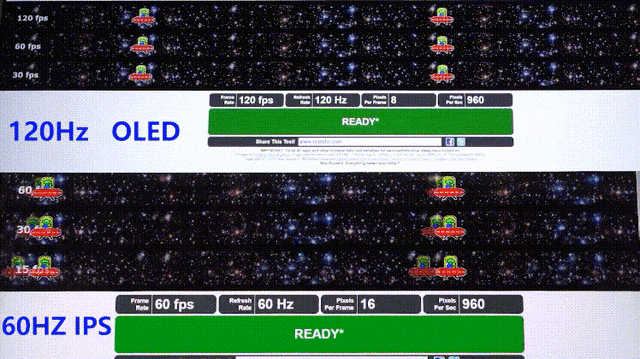上面是120Hz刷新率的华硕无双屏幕直拍图,下面是某款60Hz刷新率笔记本屏幕的直拍图,可以清晰的看到,如果屏幕最高只有60Hz刷新率的话,动态图像的拖影就会非常明显,相反,120Hz或者更高刷新率屏幕显示的动态图像就更加平滑。大家也可以参考下面的动图来感受一下高刷屏和低刷屏的差异: