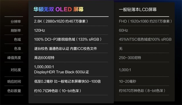 同时,华硕并非简单为笔记本配一块OLED面板,而是针对OLED屏特性,进行了相关技术的自研开发。华硕无双这块120Hz高刷OLED屏,拥有2880×1620分辨率,支持100% DCI-P3色域覆盖,并且除原生色域外,还提供了sRGB、DCI-P3以及Display P3三种色域切换。同时,这块屏幕还支持HDR600.以及ASUS OLED Care、像素级补偿技术在内的OLED屏专有技术。