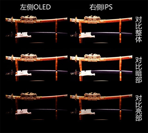 首先可以看到,OLED屏暗部细节更加丰富。如图一所示,刀身部分OLED屏曝光控制极佳,能够还原出木头刀鞘的质感,而且若隐若现的紫色区域也没有缺失。而IPS屏幕显示出来的效果甚至由于部分区域过曝而改变了刀身本来的色彩,同时过曝也体现在白色绳结区域,OLED屏完全保留了绳结细节,而IPS屏则几乎确实殆尽。