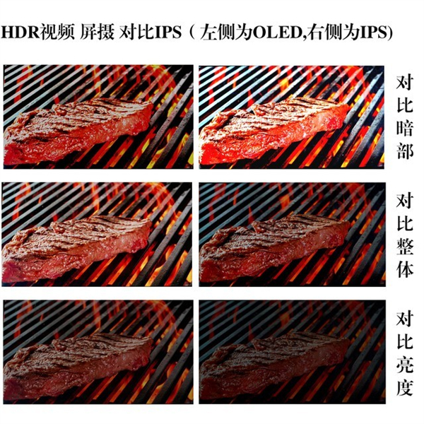 其次在色彩表现上,以图二为例,牛排和火焰部分,IPS屏效果明显有些失真,而OLED屏则还原出了比较真实的色彩细节。同时,时下一些游戏和不少视频都已经支持HDR,使用华硕无双可以直接欣赏HDR视频或HDR游戏画面,体验绝佳视效。同时,华硕无双这块OLED屏出色的素质,也能够更加原汁原味的展现HDR的魅力。