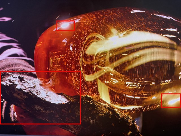 HDR关闭时,右侧红框中光芒明显过曝,左侧红框区域的高光部分也失去了控制。