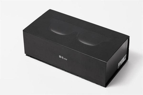 作为一款 XR 终端设备,你很难想象雷鸟 Air 的包装可以如此简洁、小巧,与过去这类设备又傻又大的包装完全不同。通体黑色,表面带有浅浅的同心圆纹理和眼镜正面的烫印图案,看起来低调、神秘而有科技感。