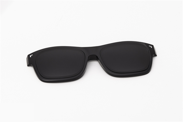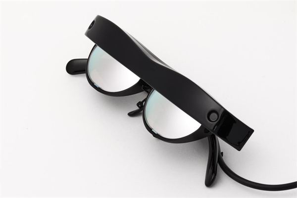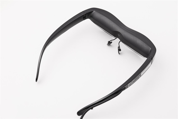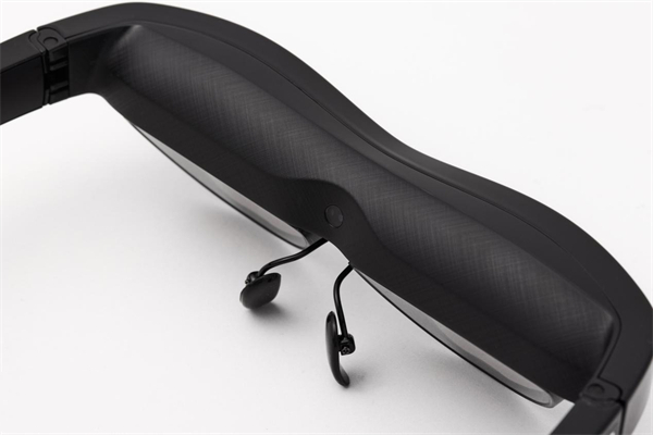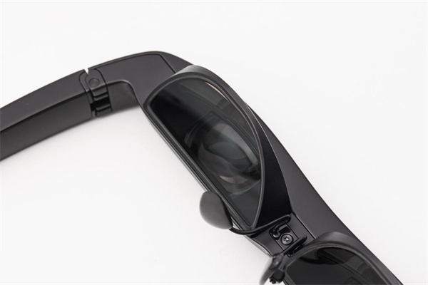 镜框前沿的两侧有一对凹陷的磁吸模块,用来吸附镜片。当黑色的镜片戴上后,整机就浑然一体了,看不出镜框的宽度了。