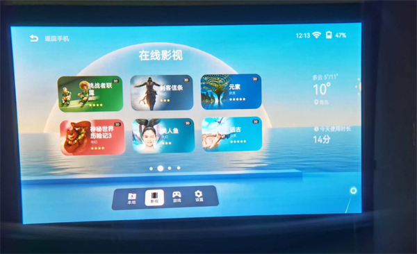 在雷鸟 Air 软件系统主界面,有本地、影视、游戏和设置四大栏目,主屏界面的左侧有亮度、电量等快速设置按钮,右侧整合了天气等信息栏,整个系统界面还是比较清爽干净的。