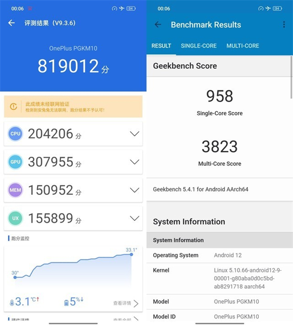 首先是传统项目跑分环节,根据实测结果,搭载天玑8100处理器的一加Ace安兔兔跑分成绩为819012分;GeekBench 5.0单核成绩为958分,多核成绩为3823分。整体表现达到了旗舰机型的平均水准,对于一款中端机型来说,这样的成绩无疑是十分优秀的,完全能够满足日常软件和大型游戏运行等需求。