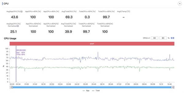 以上文测试中的《原神》为例,我们把游戏内画面设置设为60帧高画质。在不开启插帧功能的情况下,通过数据可以看到,游戏过程中,CPU使用率为43.6%,同时CPU使用率曲线波动较大,容易影响游戏流畅度。