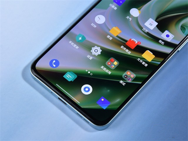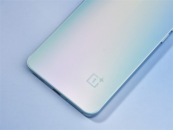然后我们来看看后盖,作为手机上唯一一块可以让厂商自由设计的完整空间,一加Ace自然没有浪费。其拥有开黑与回蓝两款配色。我们手上的这款是回蓝配色,这一配色下,后盖呈现出一种蓝绿交融的颜色,随着角度的变化,后盖颜色也随之流转。