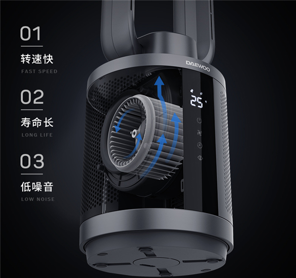 大宇无叶风扇F9 MAX通体黑色太酷炫,机身设计简约,用无叶设计代替了很有年代感的扇叶电风扇,除了有降温通风的作用,还可以通过滤网净化空气,一年四季都可以用。