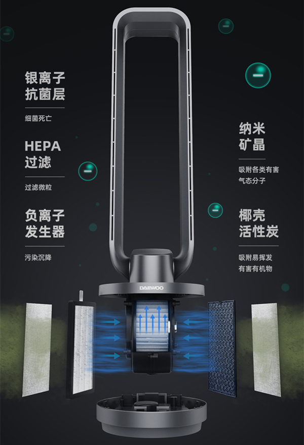 大宇无叶风扇F9 MAX五道净化为你挡下脏乱,开机瞬发澎湃负氧离子,使漂浮污染物结团沉降,同时配合滤网净化,给你森林般纯净空气。机身里面带有纳米矿晶滤网和12级HAPA滤网,双重净化这点比市面上不少的无叶风扇优秀多了。去除空气中残留的甲醛、PM2.5和异味,出风时能明显感觉空气清新味道,还能对抗花粉细菌。